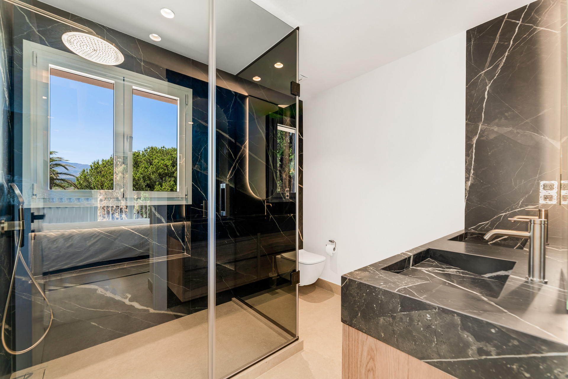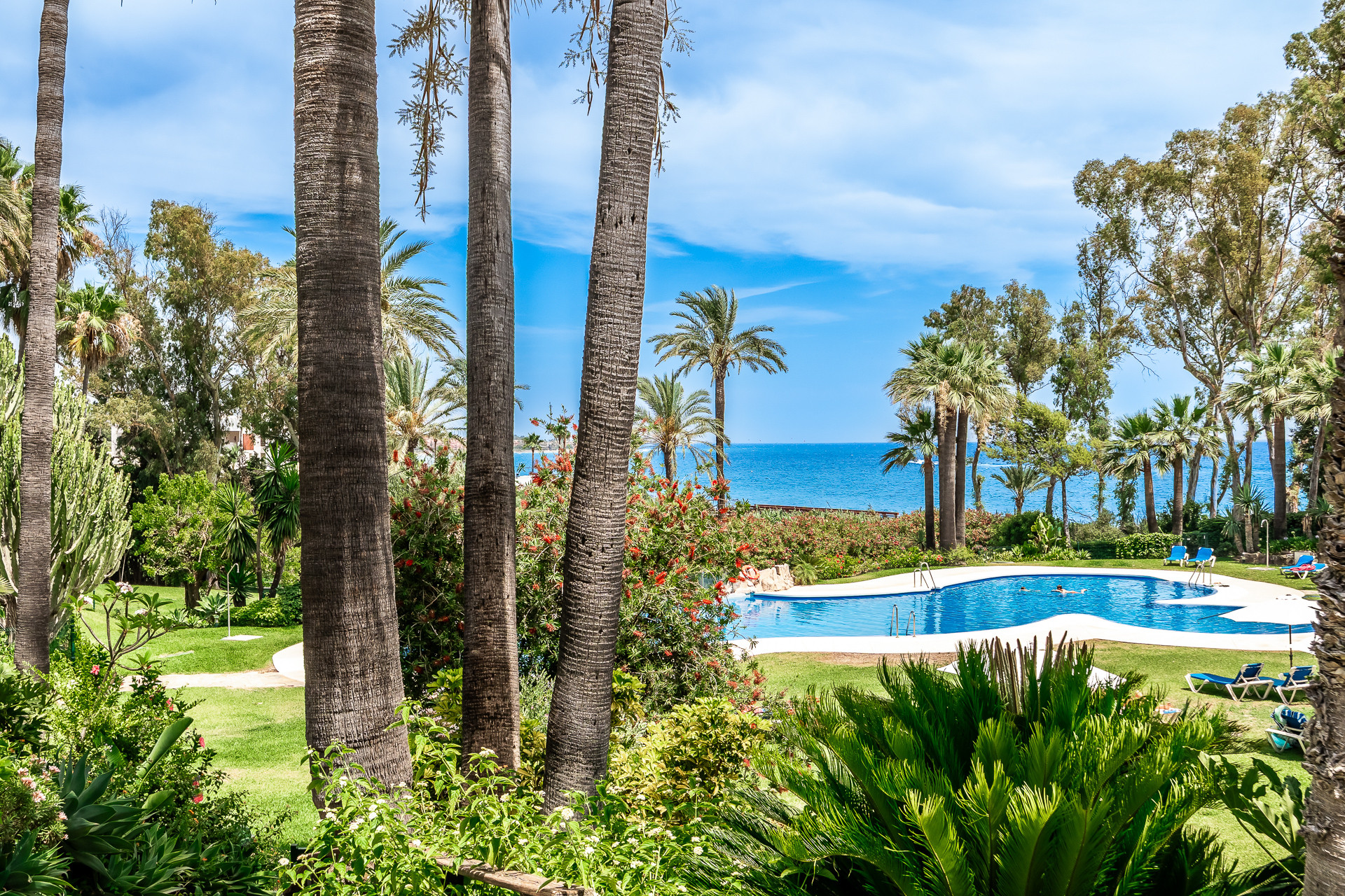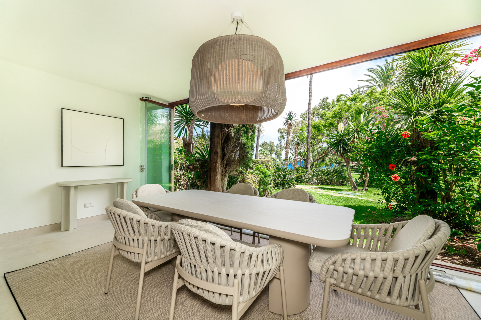 This fully renovated, luxury townhouse in the prestigious New Golden Mile offers an unparalleled beachfront lifestyle. Spread over three floors with a private lift, the home features four spacious bedrooms, four en-suite bathrooms, and a guest toilet, all finished to the highest standards with brand-new electrical and plumbing systems, ceilings, floors, windows, and cladding. Designed for comfort and elegance, it boasts underfloor heating throughout, DAIKIN air conditioning, an electric fireplace, a modern MIELE-equipped kitchen, a separate laundry room, and a drinking water filtration system. Delivered fully furnished with designer pieces, the property is ready to move in. Three expansive south-facing terraces provide breathtaking sea views, perfect for enjoying the Mediterranean climate. Additional highlights include private covered parking with a pergola for two vehicles, and access to a secure gated community featuring two swimming pools (one heated), a tennis court, lush tropical gardens, and direct beach access. This exceptional townhouse represents a rare opportunity to own a contemporary, fully equipped luxury home in a prime beachfront location.
