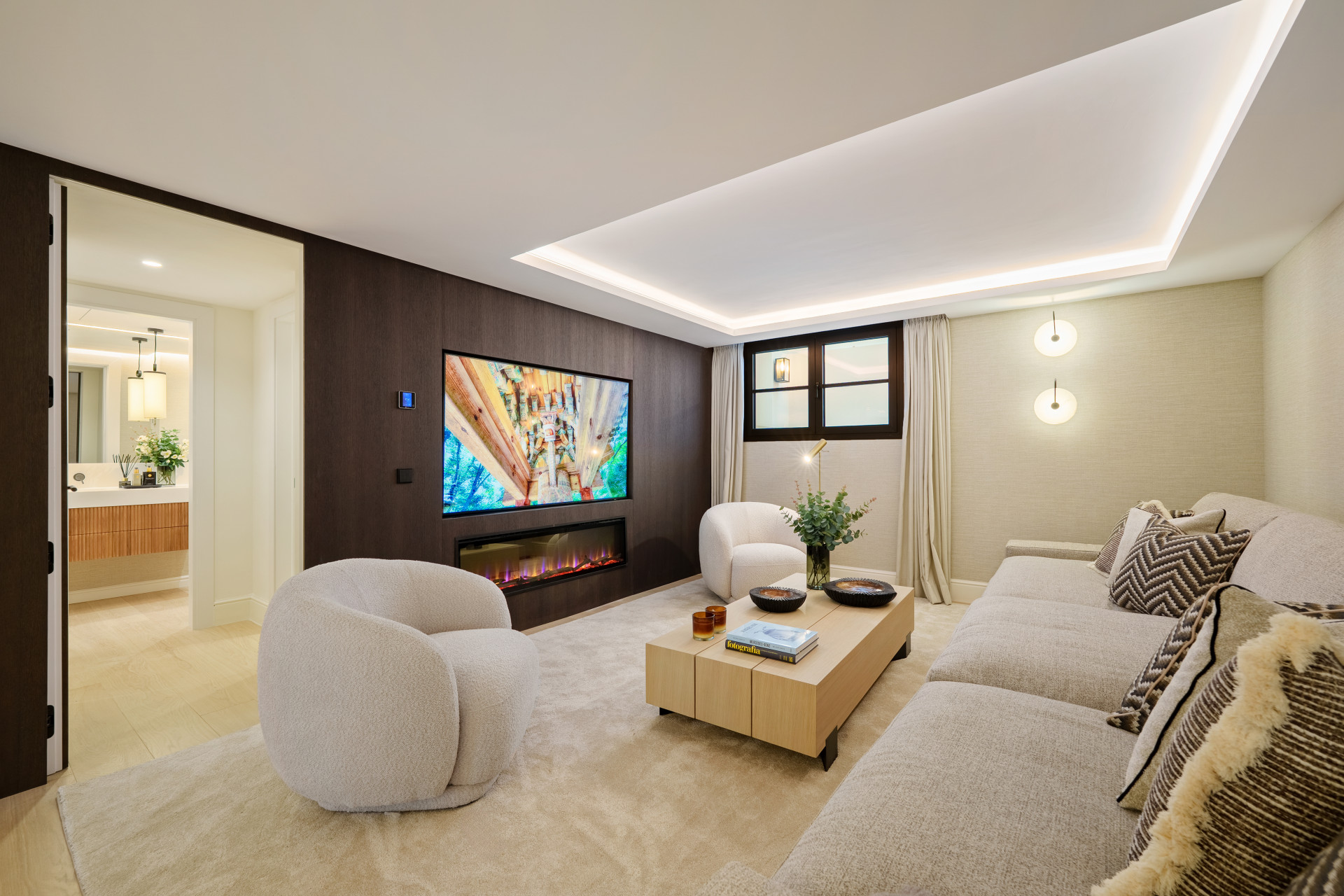 The home offers five beautifully designed bedrooms, including a private primary suite on the upper level with direct terrace access and sweeping coastal views. Each room follows a consistent design language of neutral tones, bespoke carpentry, and carefully considered lighting. The upper floor opens onto expansive outdoor areas that fully embrace the panoramic setting. On the lower level, a dedicated entertainment space enhances the lifestyle offering, complete with a home gym, sauna, entertainment room, and a climate-controlled wine bodega. Outside, landscaped gardens frame multiple seating and dining areas alongside a striking private pool, all just minutes from golf courses, international schools, and the amenities of Nueva Andalucía and Marbella.