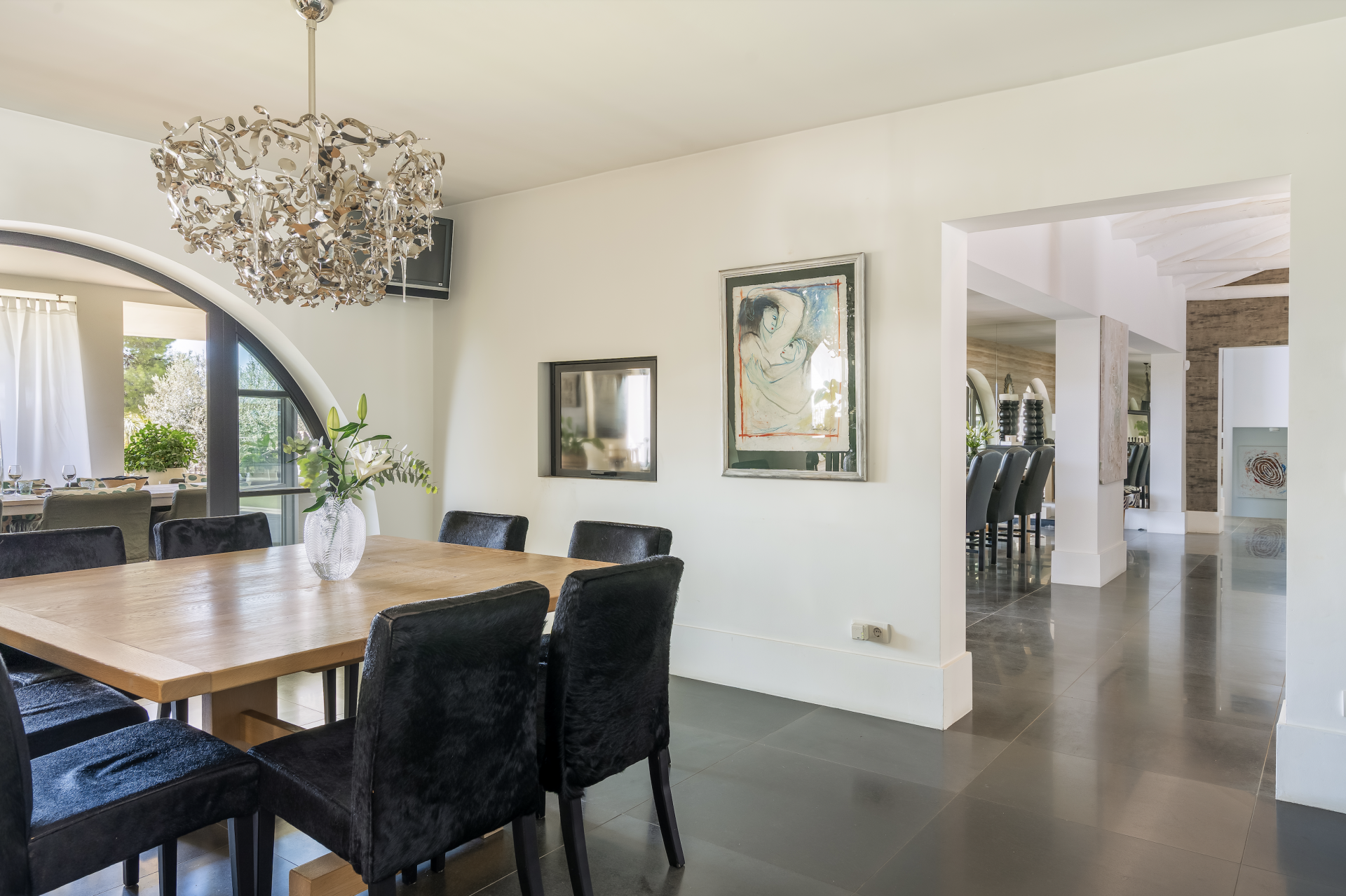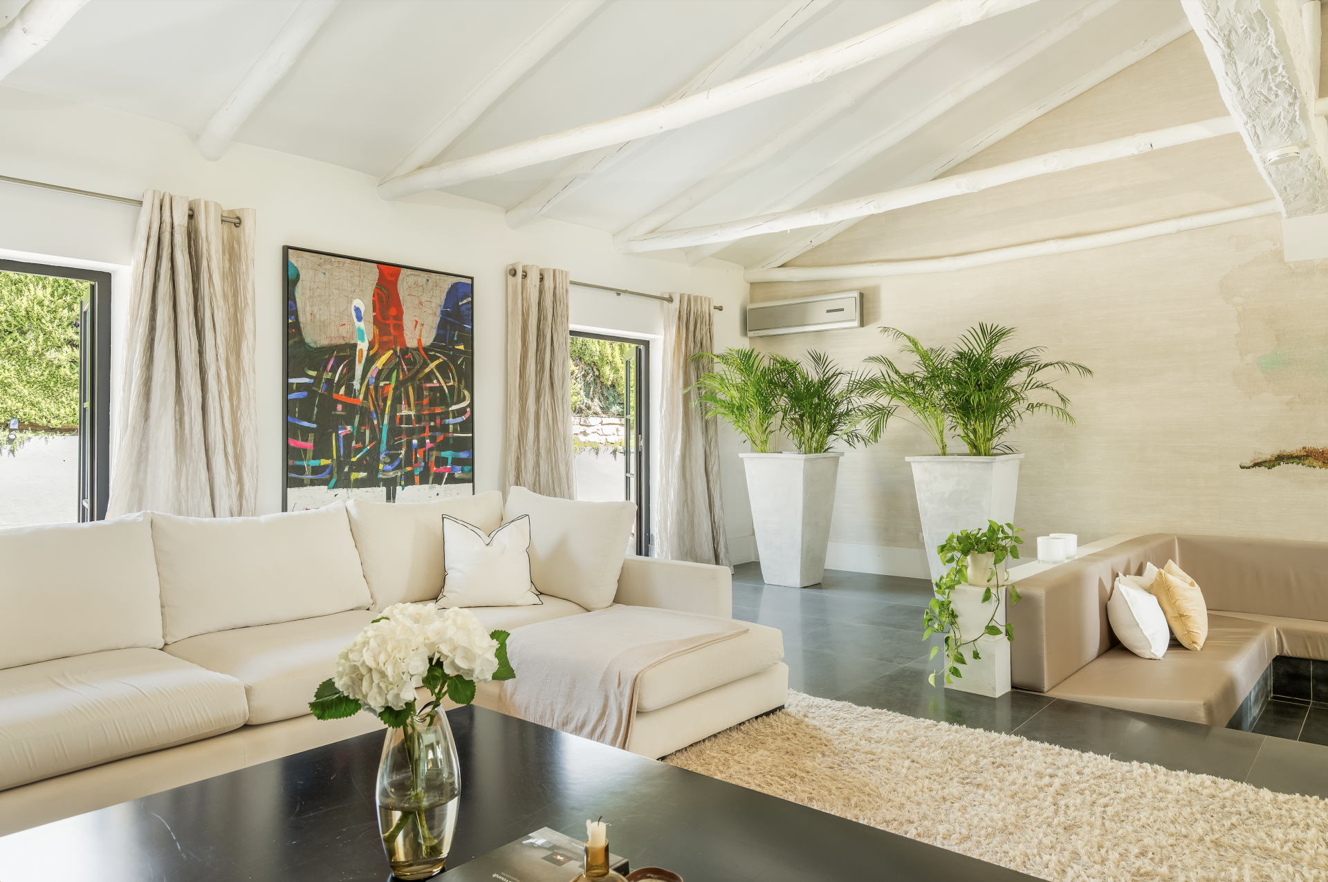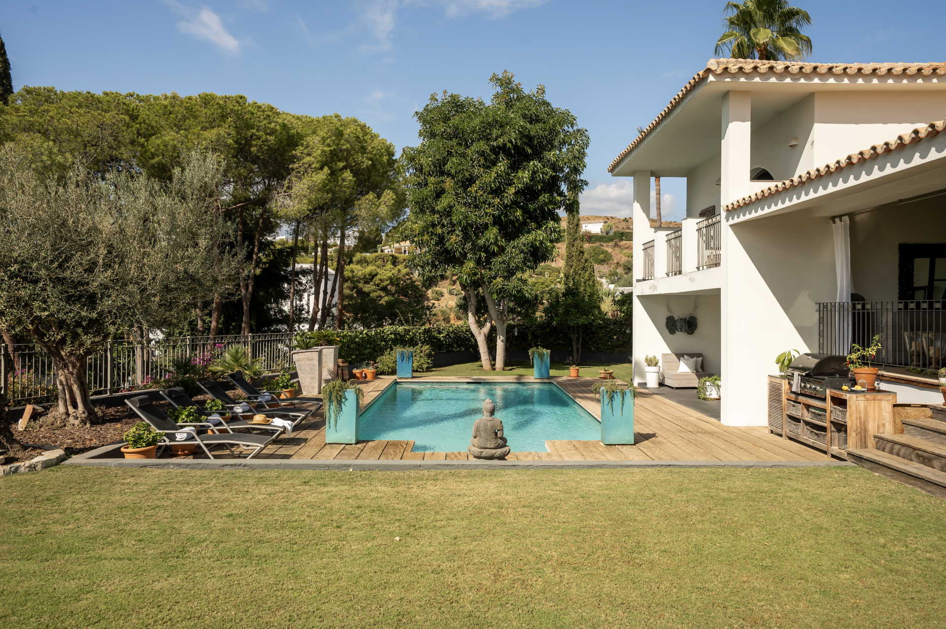 Nestled in the prestigious Benahavís area above El Paraíso Golf, this exquisite 4-bedroom villa combines Andalusian charm with contemporary elegance, offering privacy, tranquility, and breathtaking sea views. Renovated in 2006, the home boasts a bright, open-plan kitchen with two central islands, a utility room, and seamless access to sun-drenched terraces and landscaped gardens. The spacious living and dining areas, enhanced by two fireplaces—including a dramatic double-sided feature—open onto the main terrace through premium Roman Clavero carpentry windows and doors, perfectly blending indoor and outdoor living. A high vaulted ceiling with exposed wood beams adds warmth and character. The upper level is dedicated to a luxurious master suite with walk-in wardrobe, en-suite bathroom, private balcony, fireplace, and a separate home office, while the lower floor hosts three additional bedrooms, two bathrooms, and a versatile laundry/storage room. Completing the layout is a fully independent guest apartment with garden access and extra attic storage that could be converted into an additional room. Set on a 1,600 m² plot, the villa features a generous swimming pool, lush gardens with fruit trees, multiple covered lounge areas, and terraces offering sun and shade throughout the day, making it a truly exceptional family home designed with meticulous attention to detail.